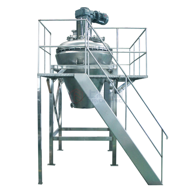 本機由加熱錐體設有加熱夾套,熱源為熱水、導熱油或低壓蒸汽,從而使錐體內壁保持一定的的溫度。變頻調速電機經平行斜齒輪減速機,驅動單螺帶攪拌器旋轉,帶動物料沿錐型筒旋轉並自下而上提升,物料到達頂後由重力和慣性作用,自動流向旋渦中心回到錐型筒體底部,整個過程使物料在錐型筒體內強製加熱,相對對流、摻混,熱量在物料中相互擴散,使物料作全方位的不規則往複運動,完成物料在筒壁表麵進行高頻率傳熱交換,在短時間內達到加熱幹燥的效果。從而使物料內部水份不斷蒸發,在真空泵的作用下,水蒸汽由真空泵引出,如須回收液體可加冷凝器、回收液儲罐回收。幹燥完成後,打開下部的出料閥出料。